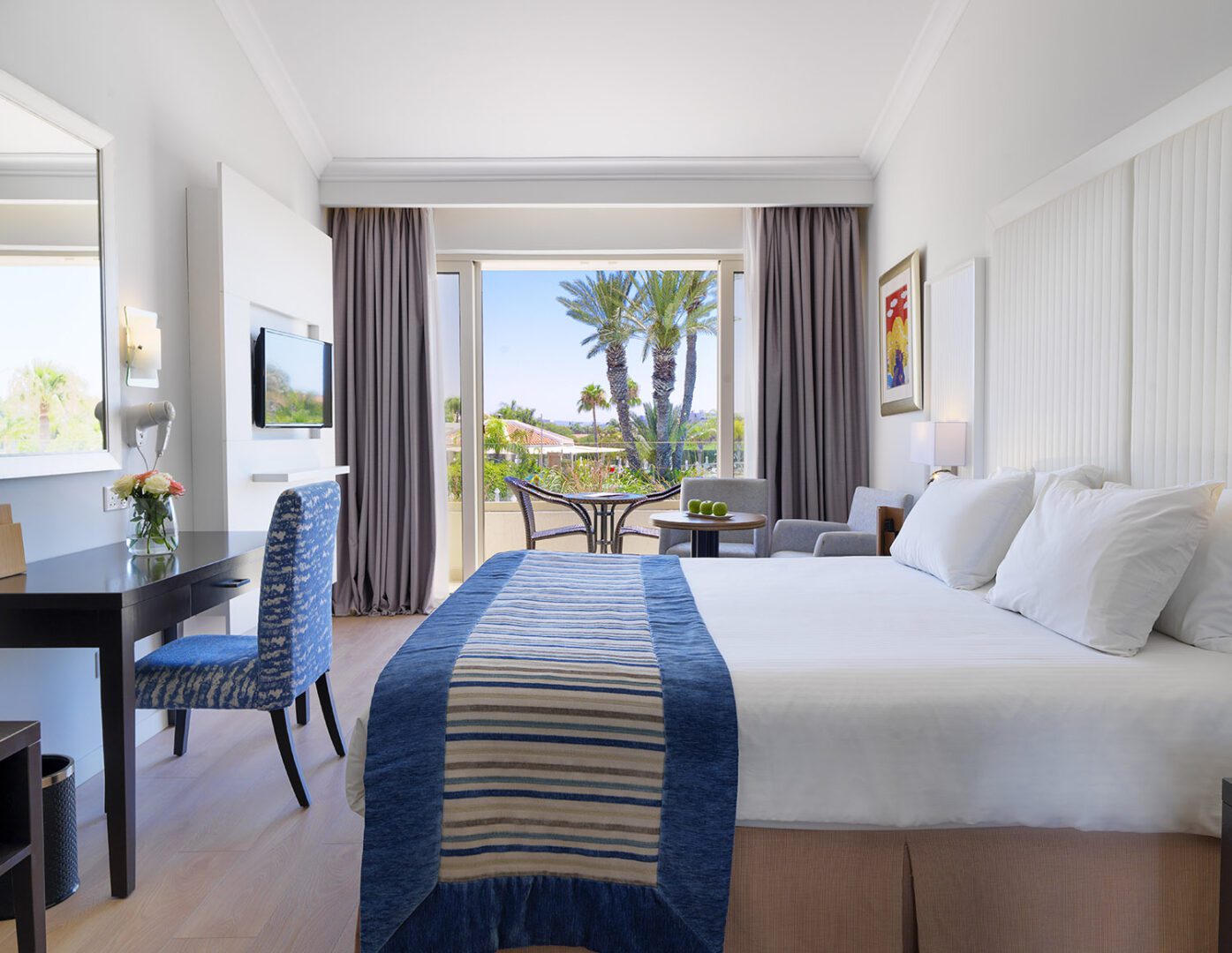 Mediterranean colours and comfort define this spacious Deluxe Superior Room for up to 3 guests. Special features include a generous and comfortable lounge area, large balcony overlooking the lush gardens and pool, and a luxurious twin-vanity marble bathroom with full-size window to the bedroom. Practical..
