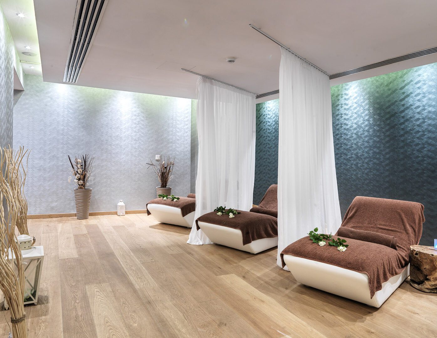 One of several types of Family Junior Suites, this version on the upper floor with a large balcony provides separate bedroom areas for parents and children, with a TV set in each, and a frosted glass partition wall with sliding door for proximity without compromising privacy. Room décor and amenities..