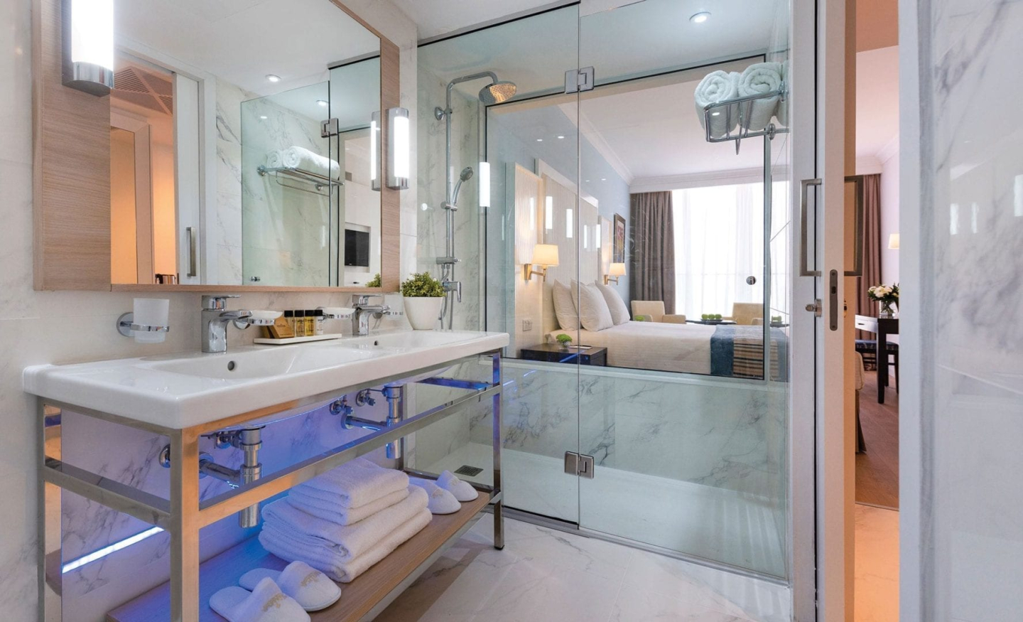 Located near the children’s area, this Family Junior Suite was designed for families with up to two children. A frosted glass partition wall and door invites ample daylight into the parents’ bedroom, without compromising their privacy. Each area has its own TV set, but the whole family will enjoy relaxing..
