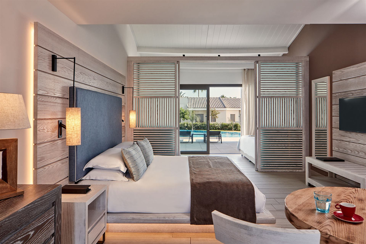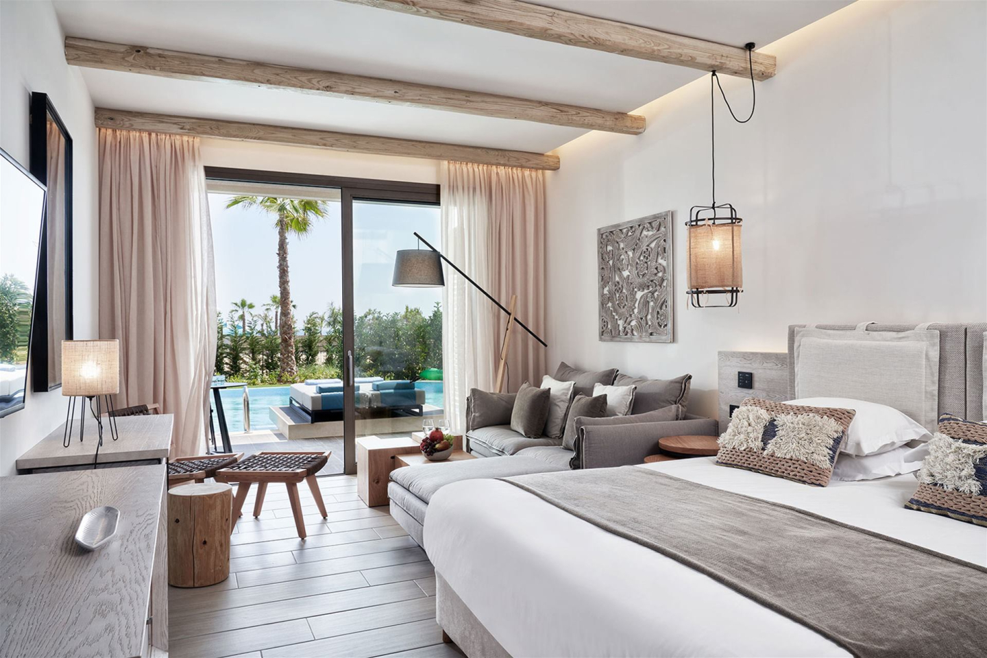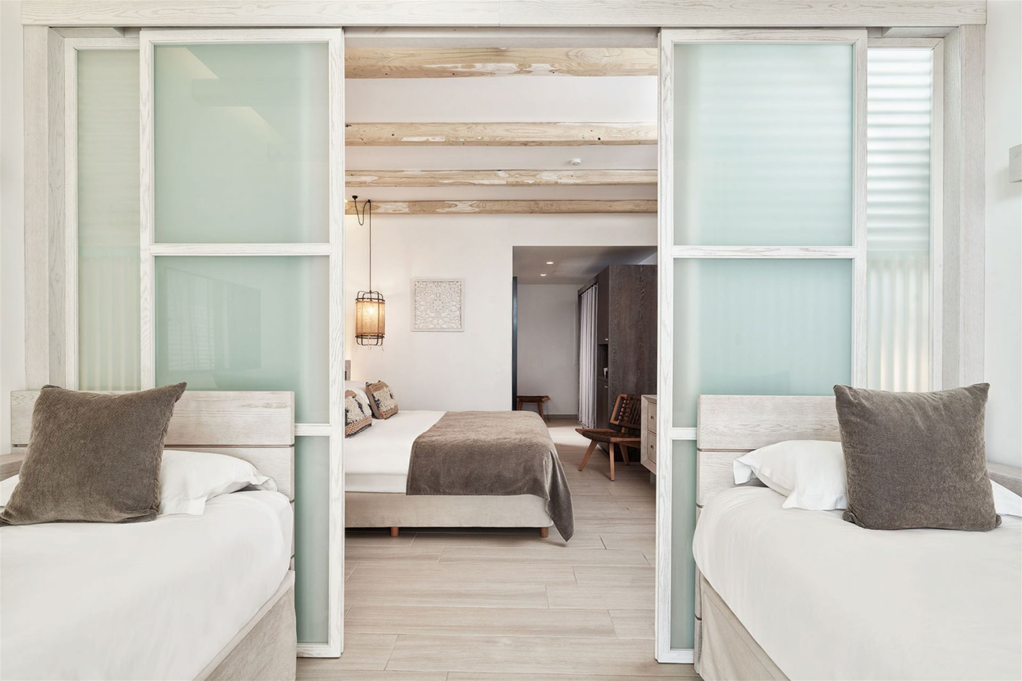 42-56 m2. Max Occupancy: 4 Persons. (min. adults: 2, max. children: 2). Similar to the One Bedroom rooms, these room types have the added benefit of direct access to the pool from your terrace. There's a separate bedroom with double bed and a separate living room area with a permanent corner sofa bad..