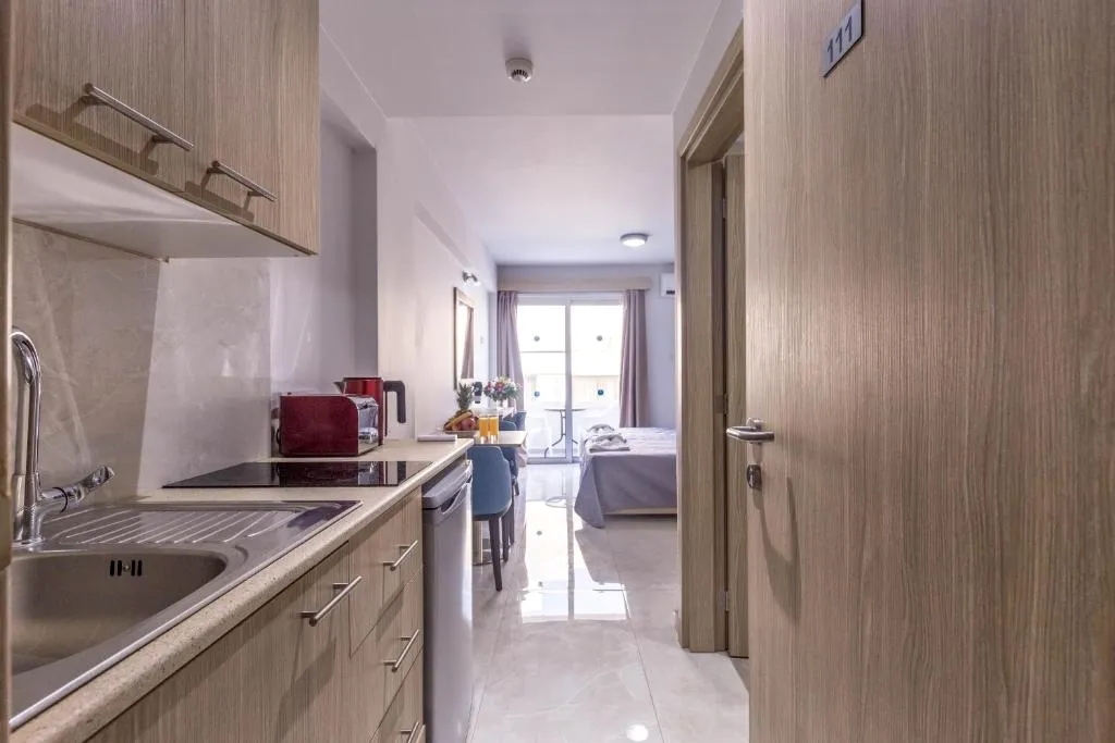 Studio Apartment, features two single beds a private bathroom with shower, seating area and a wardrobe. This room type accommodates two persons and it is equipped with a kitchenette for self catering , stove top, kitchen utensils, kettle , toaster , refrigerator , dressing table , hairdryer , air condition..