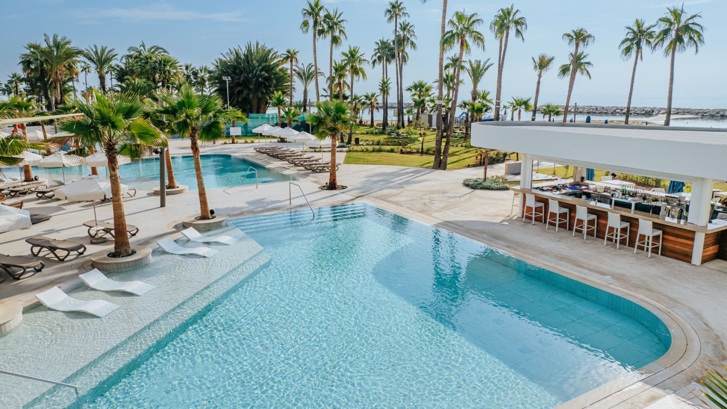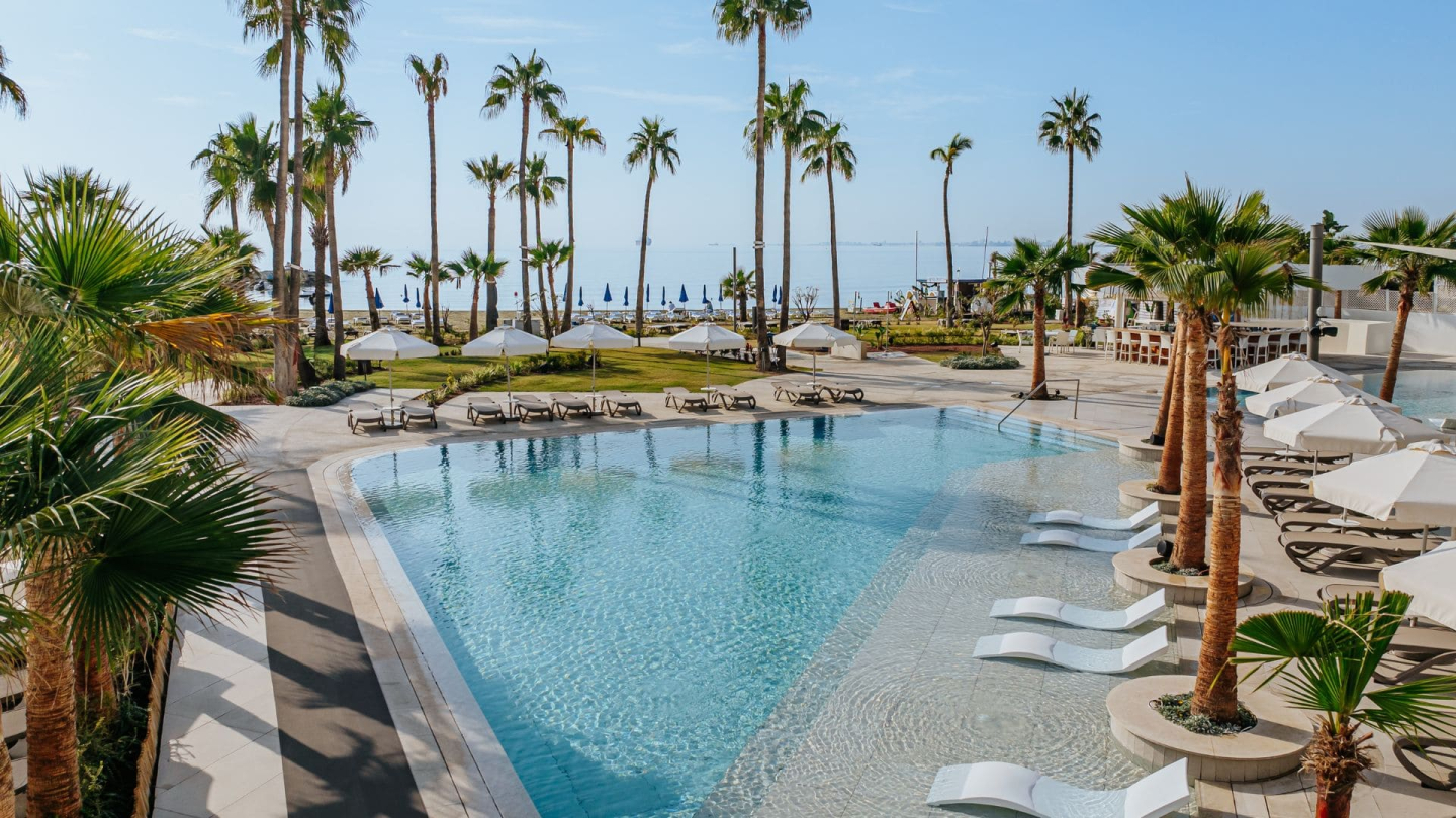 A well-known 4-star hotel on the seafront, located in Larnaca. It is situated directly on a sandy beach, about 8–10 km from the city center. The beach itself has Mediterranean sand and calm waters typical of this area, suitable for swimming and relaxation.