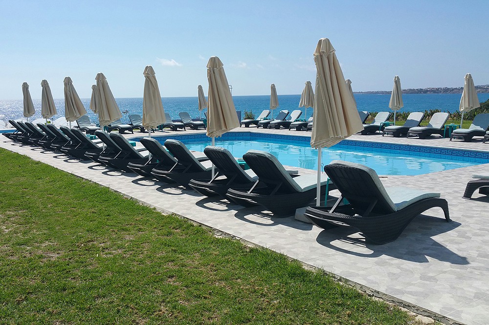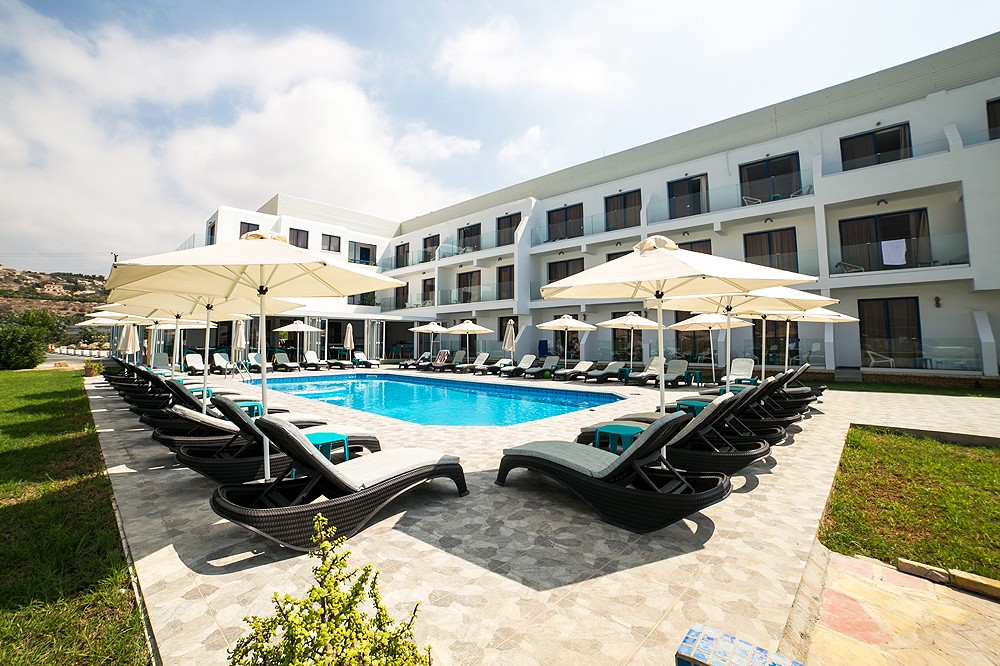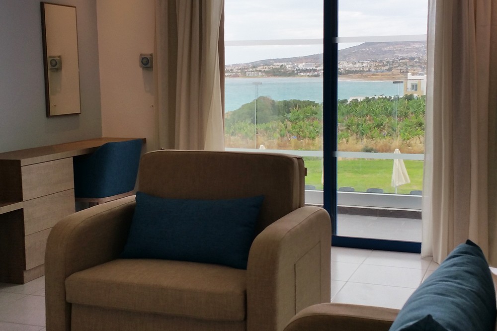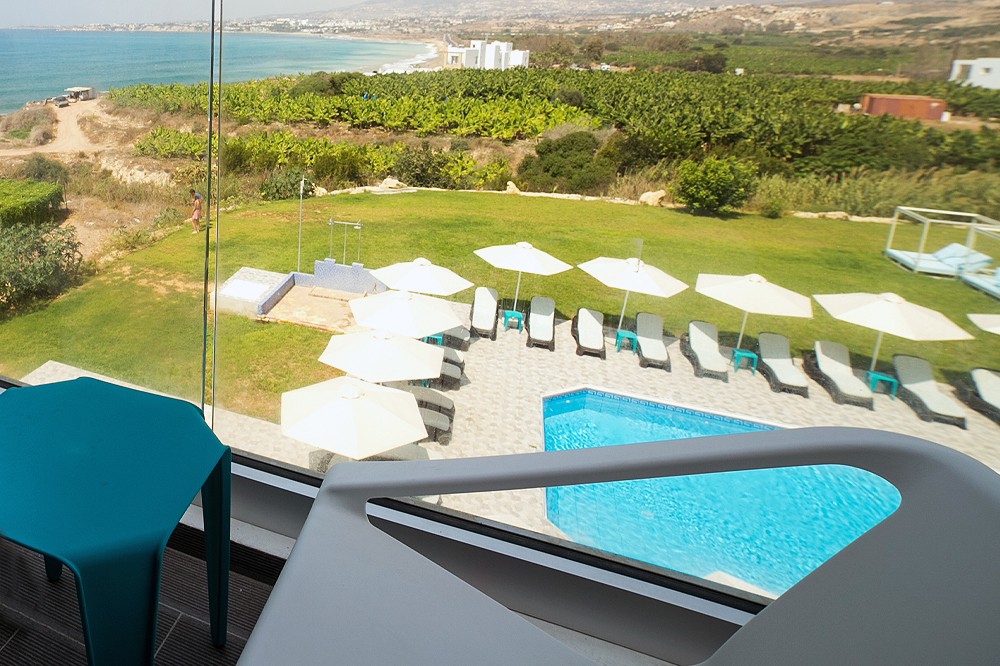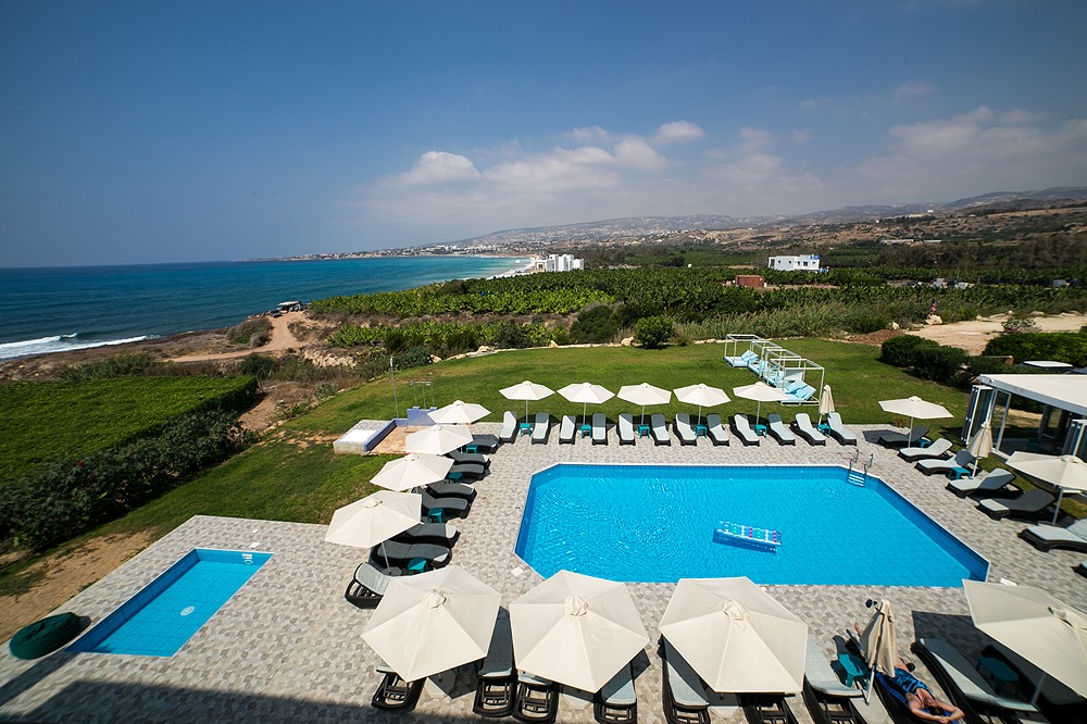 The hotel's swimming pool looks directly to the blue Mediterranean sea and towards Coral Bay. A short walk downhill brings you to the beach and further along the coast, within easy walking distance is an organised sandy beach, where drinks and snacks may be purchased from a well-placed cafe together with WIFI, sunbeds and umbrellas at an additional cost.