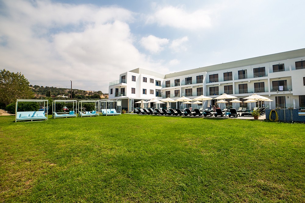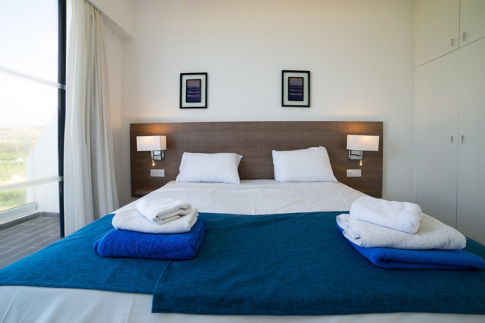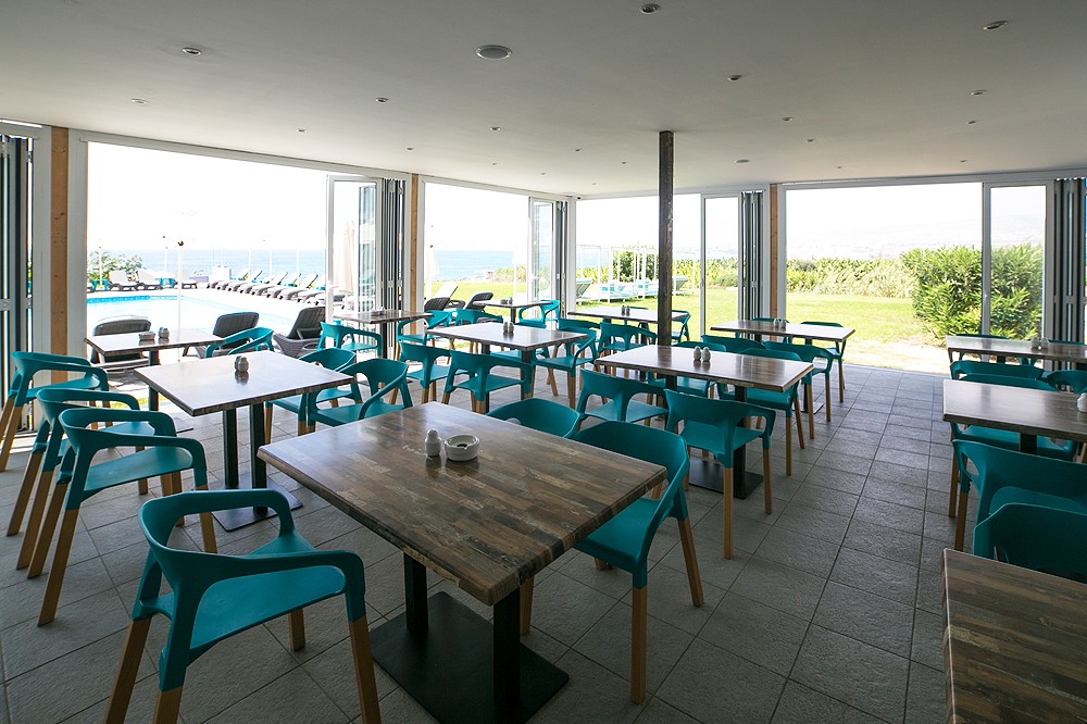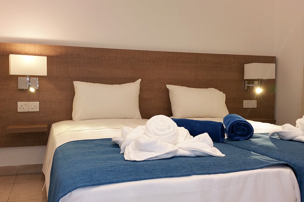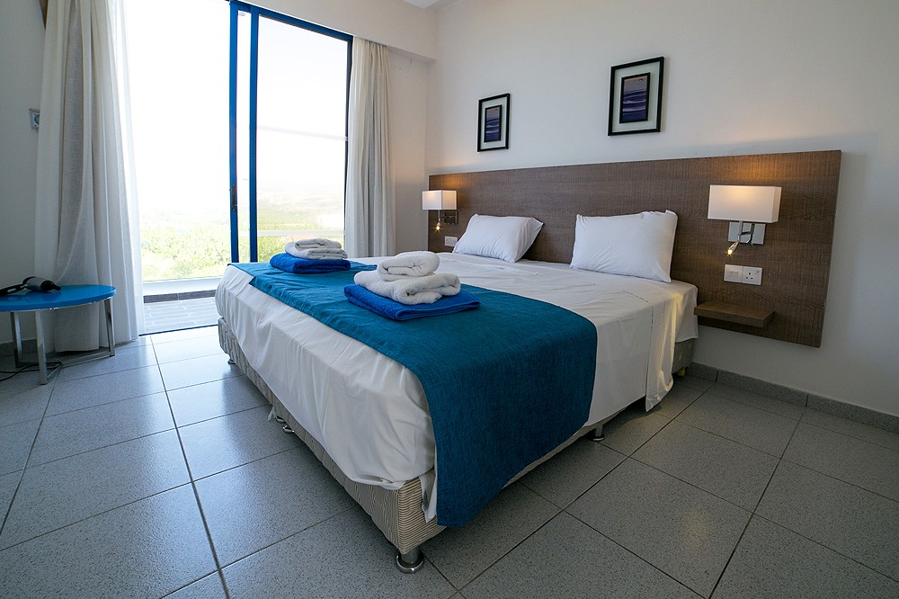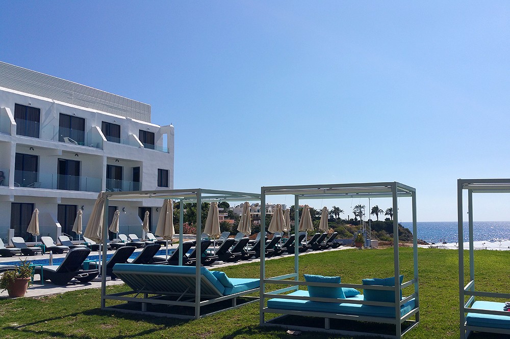 The hotel's swimming pool looks directly to the blue Mediterranean sea and towards Coral Bay. A short walk downhill brings you to the beach and further along the coast, within easy walking distance is an organised sandy beach, where drinks and snacks may be purchased from a well-placed cafe together with WIFI, sunbeds and umbrellas at an additional cost.